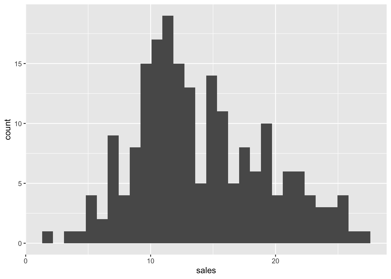 $ sales : num 22.1 10.4 9.3 18.5 12.9 7.2 11.8 13.2 4.8 10.6 ...