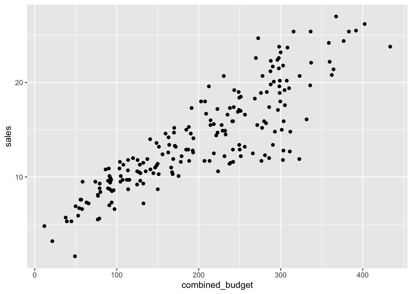 ggplot2::ggplot(advertising_clean_r, aes(x=combined_budget, y=sales)) +