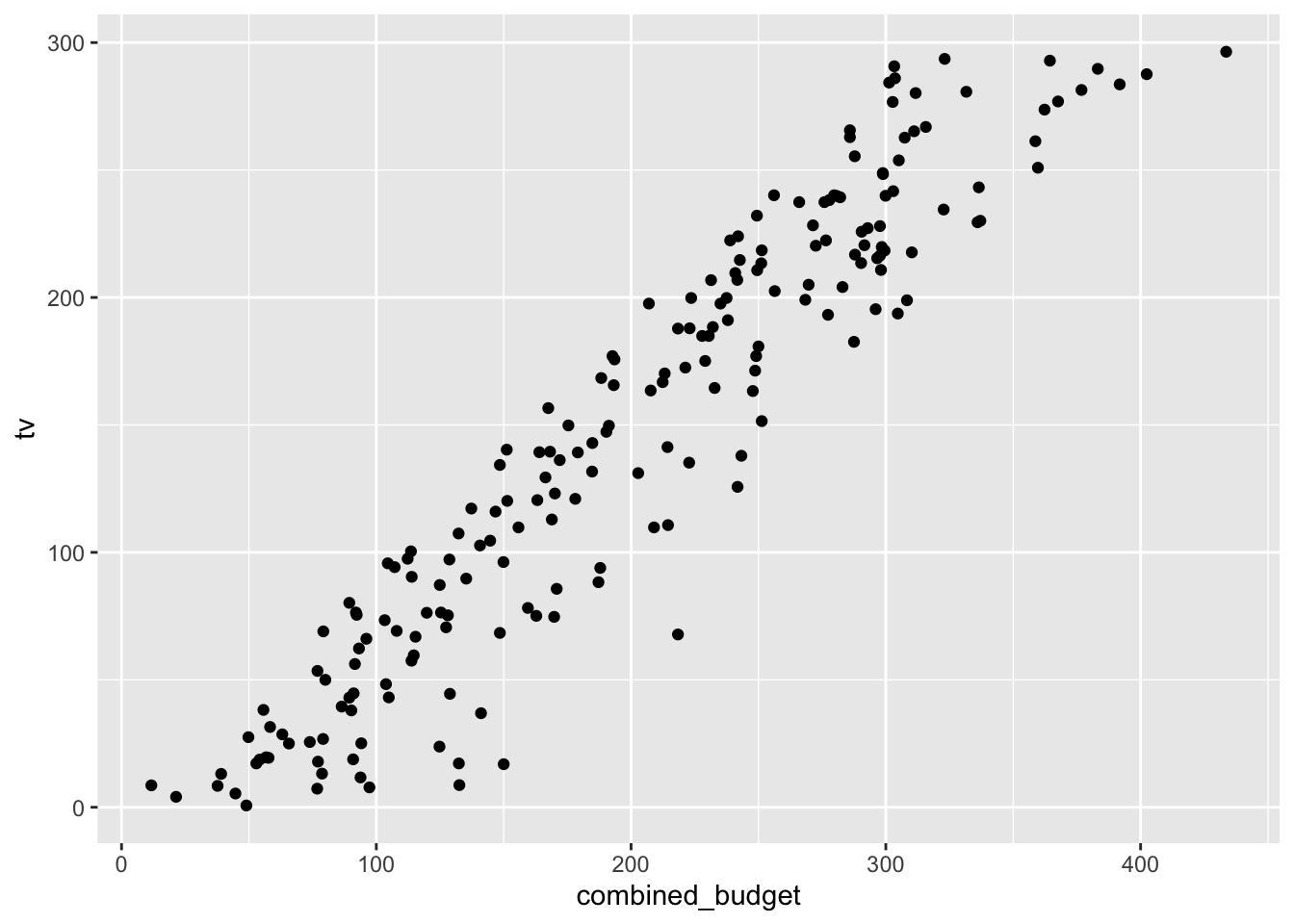ggplot2::ggplot(advertising_clean_r, aes(x=combined_budget, y=tv)) +