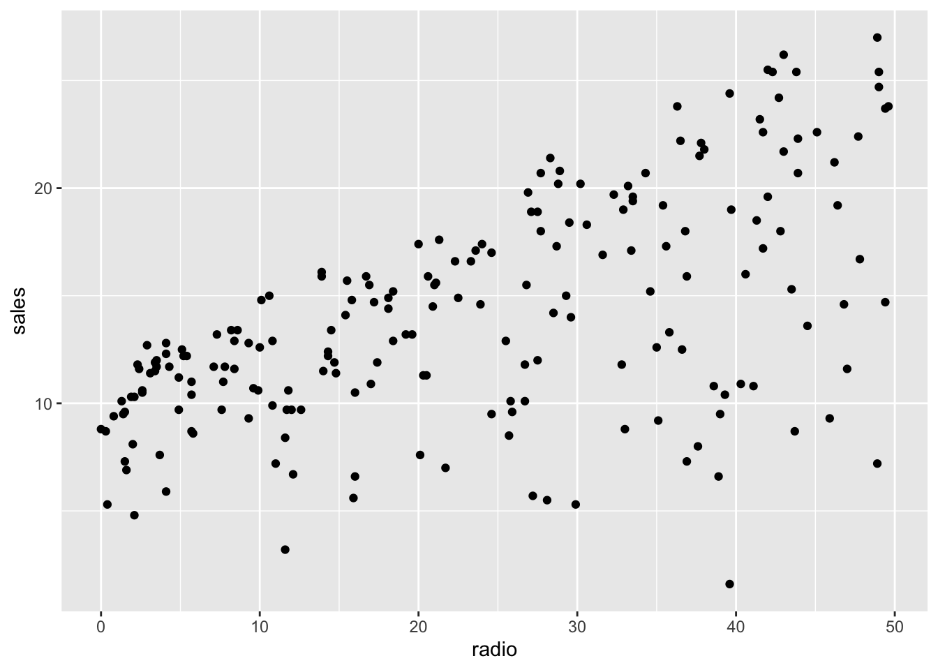 ggplot2::ggplot(advertising_clean_r, aes(x=radio, y=sales)) +
