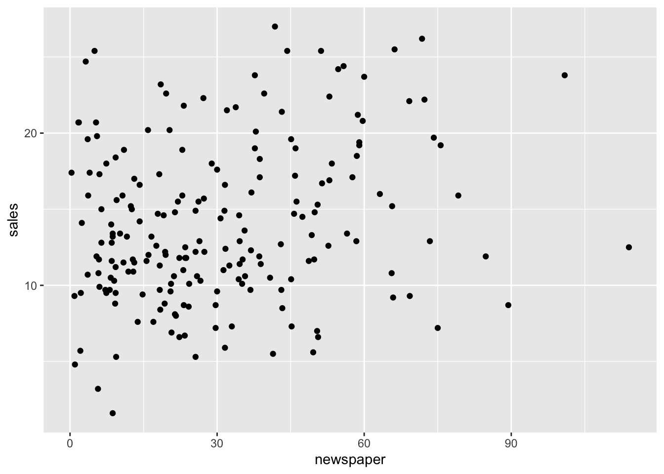 ggplot2::ggplot(advertising_clean_r, aes(x=newspaper, y=sales)) +